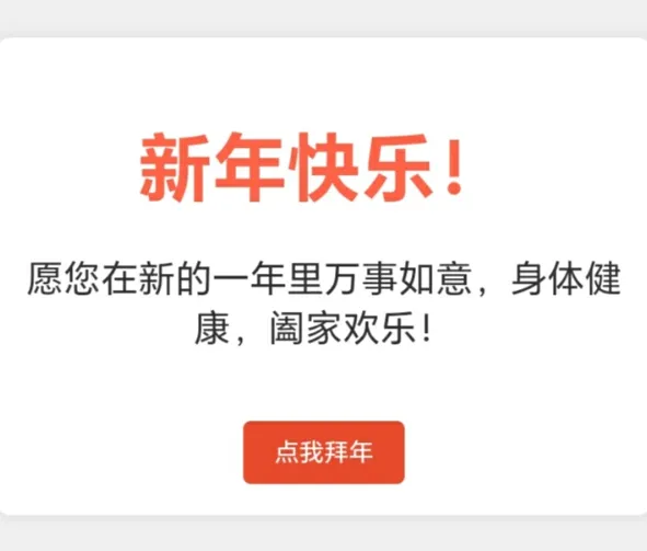 通过这些代码,你可以创建一个简单而美观的HTML页面,用于在快过年时向用户拜年。你可以根据需要进一步扩展和美化这个页面。