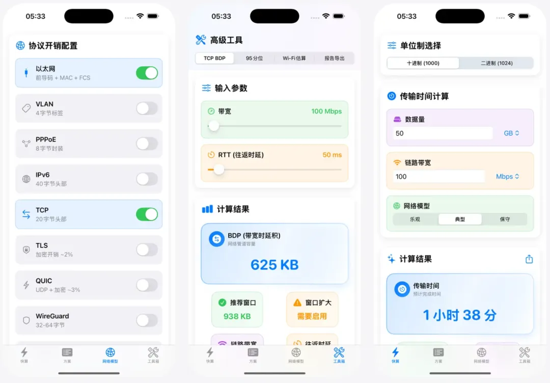 简介:提供网络带宽计算、传输时间估算、协议开销分析等功能,适用于网络规划、故障排查与性能优化。