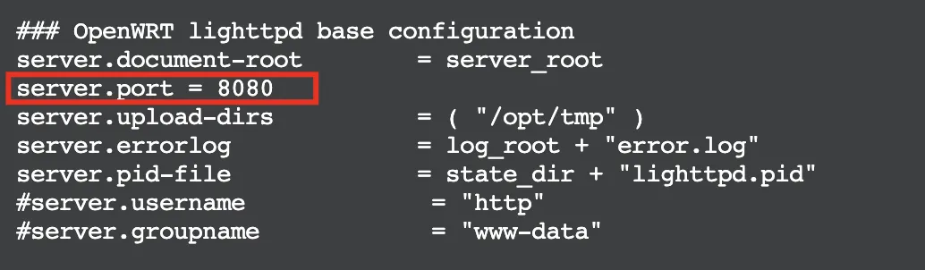 ▲ 找到OpenWRT lighttpd base configuration,在server_root下面新增一行内容server.port = 8080修改端口号