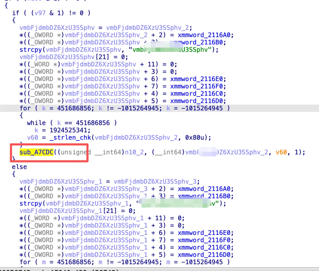 intencrypt_and_pack(constchar* input, int flag, Out* out){constchar* key = (flag & 1) ? "abQjOosSOMLBfRg05fAm" : "AbQjOosSOMLBfRg05fAm";size_t len = strlen(input);size_t out_len;uint8_t* buf = encrypt(input, len, key, &out_len);if (need_extra_process()) process_A(buf, out_len, out, flag & 1);else process_B(buf, out_len, out);free(buf);memset(out->pad, 0, sizeof(out->pad));return0;}