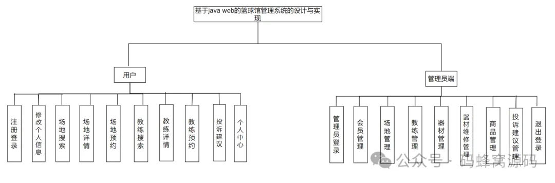 篮球馆管理系统系统包括系统登录、会员管理、场地管理 、教练管理、器材管理、商品管理、投诉建议、退出登录模块。整个系统的功能模块设计如图 :