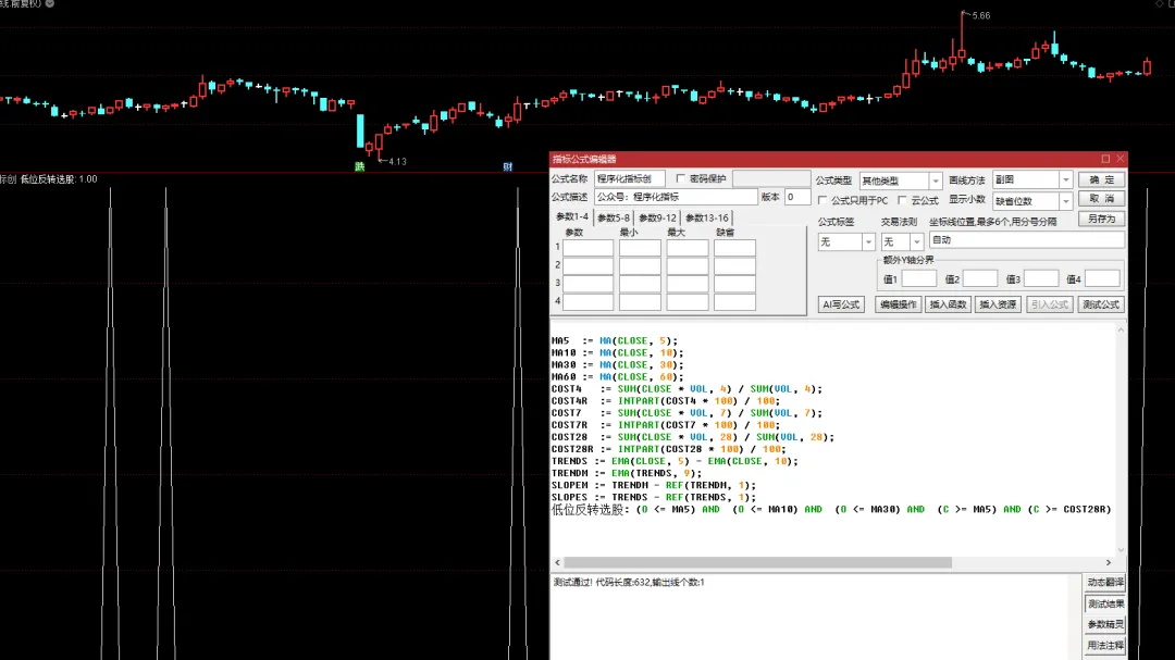 低位反转选股: (O <= MA5) AND (O <= MA10) AND (O <= MA30) AND (C >= MA5) AND (C >= COST28R) AND (SLOPEM > 0) AND (SLOPES > 0);