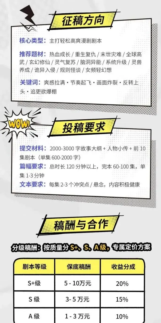 七猫漫剧的核心优势在于内容版权。七猫免费小说和纵横文学手握超10万部IP储备,这是漫剧创作最核心的底气。早在2025年11月,七猫就已宣布开放所有IP的漫剧改编权,还推出了分级稿酬政策,S+级剧本保底稿酬最高达10万元,再加上20%的收益分成,就是为了吸引创作者入局。此前其改编自纵横原创IP的动态漫《诡异游戏:开局觉醒Bug级天赋》,上线4天播放量就突破4400万,验证了IP改编的爆发力。
