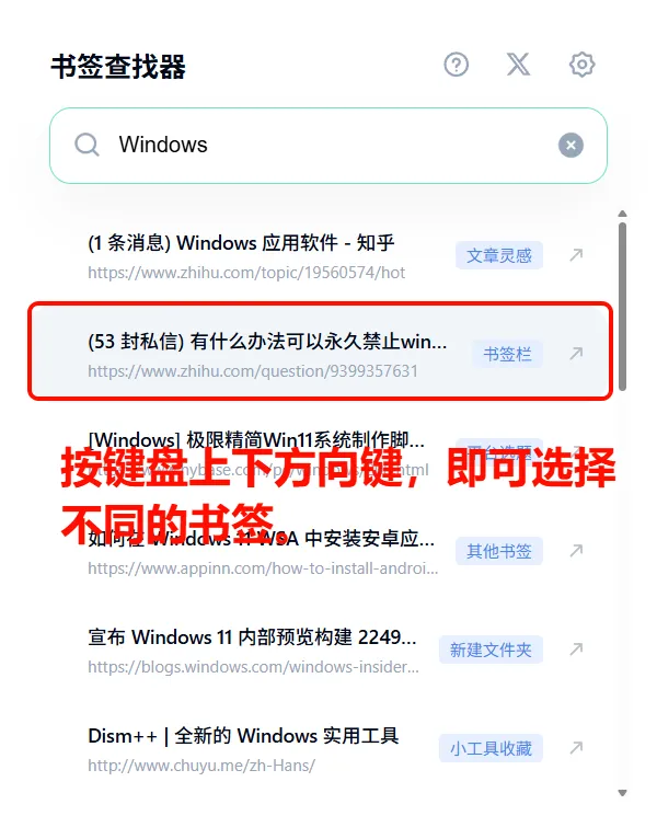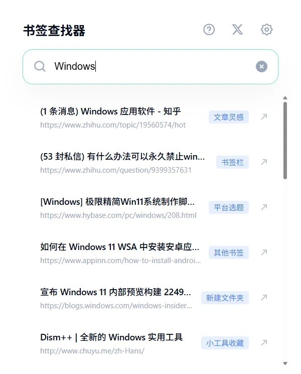 需要找书签,直接输入该书签包含的关键词。比如我这里想找有关于Windows的所有书签,直接在搜索框中输入关键词Windows即可查找,想查看哪个书签就直接点就行了。单条书签,左侧是书签内容,蓝色文字表示该书签所在的文件夹,最右侧箭头点击,可以直接打开该书签的页面(但是当前页面不会跳转到该页面)。