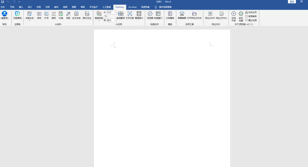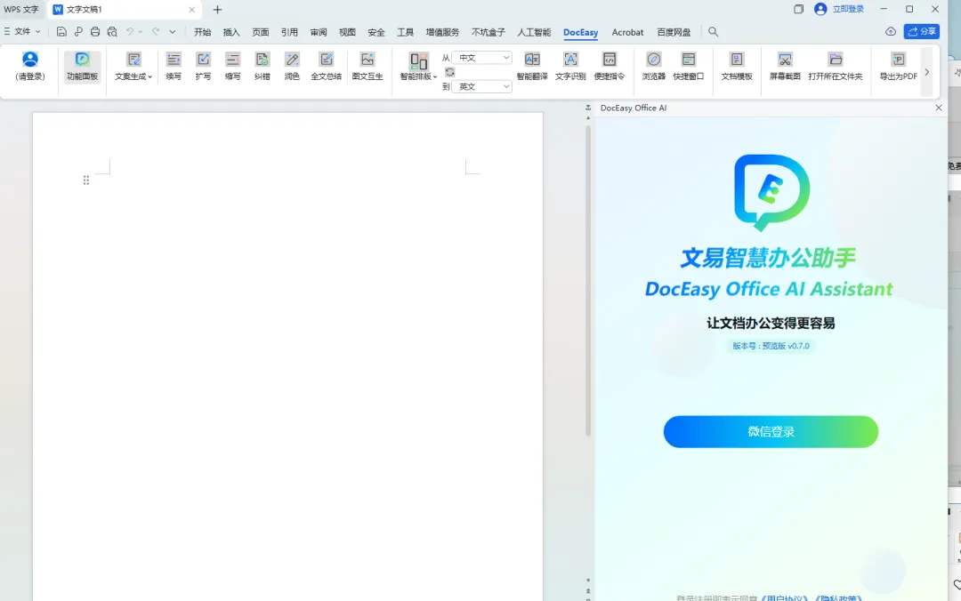 12.直接打开Office或者WPS,点击“DocEasy”,右侧也多出了AI助手,通过微信登录即可免费使用所有功能
