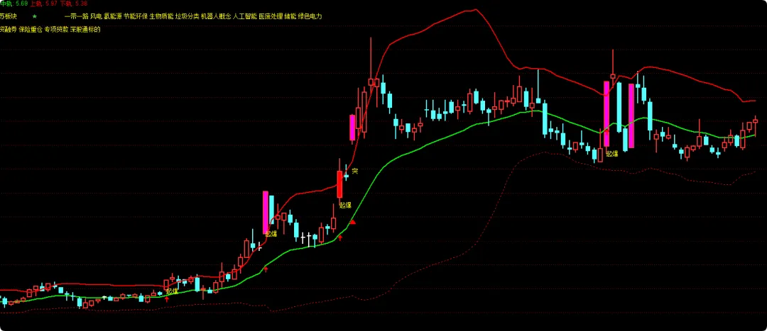 中轨:EMA(CLOSE,20),COLORGREEN,LINETHICK2;