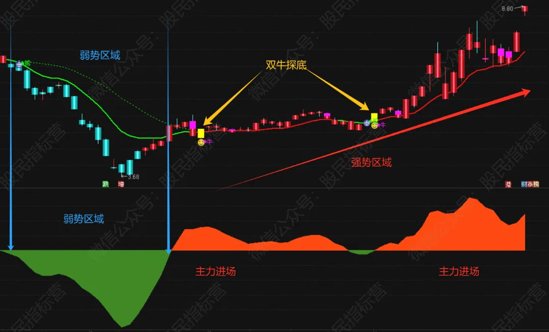 1、双牛共鸣:主图牛点现,副图红域升,此为强势共振;