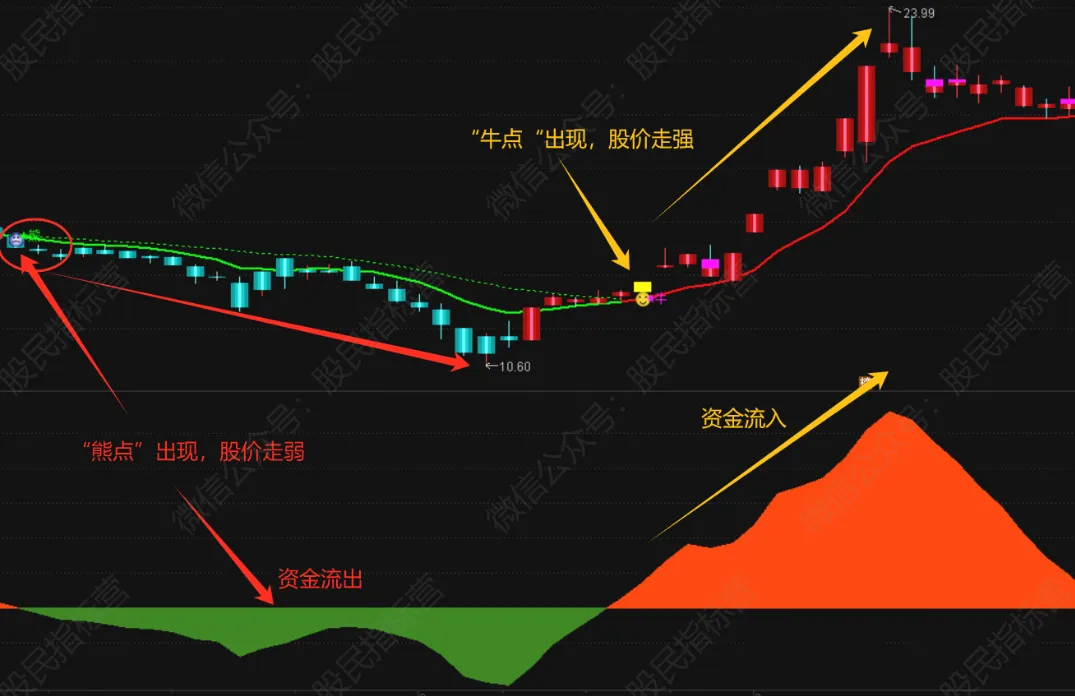 1、牛点标记:K线跃升,趋势转强;