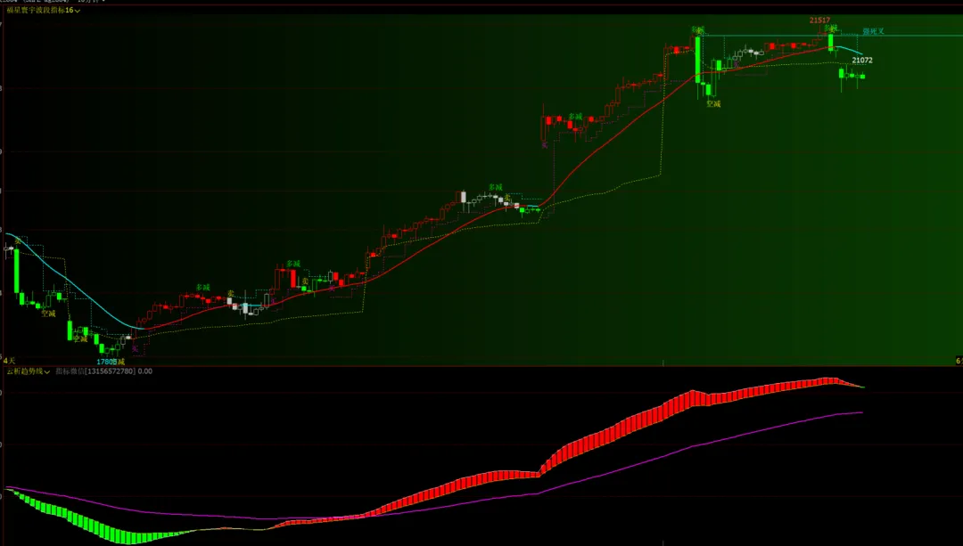 3、幅图:红绿多空柱转折,紫线是趋势线判断突破
