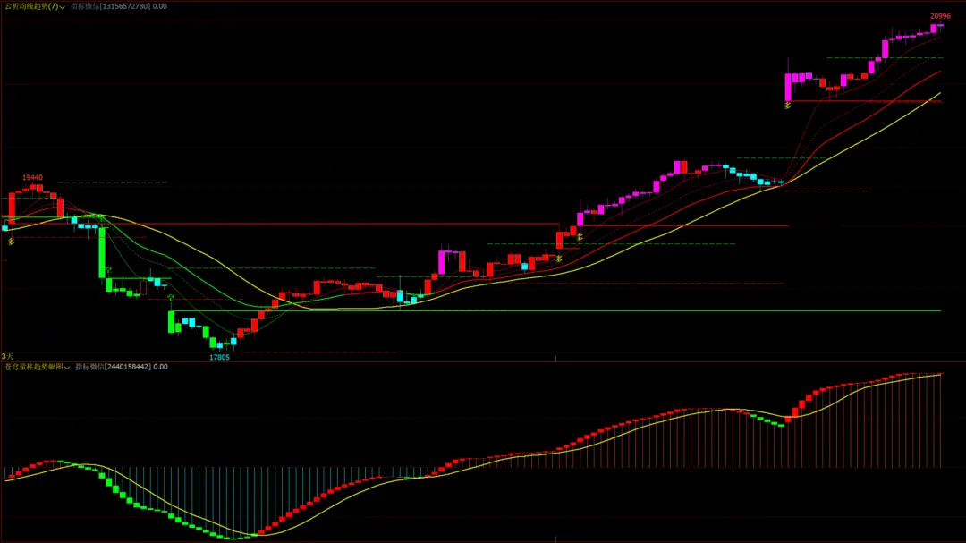 2、主图:主要是均线为主,通过多均线的融合和多空变色线来判断多空突破和排列强弱。