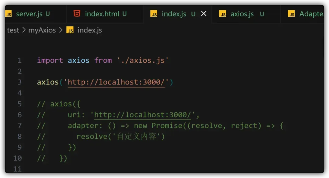 我们在测试文件夹下面新建一个 axios.js 的文件,入口内容开发比较简单,我们就不再过多赘述了,主要就是开发一个 Axios 类,初始化 axios 工厂函数以及导出 axios 实例: