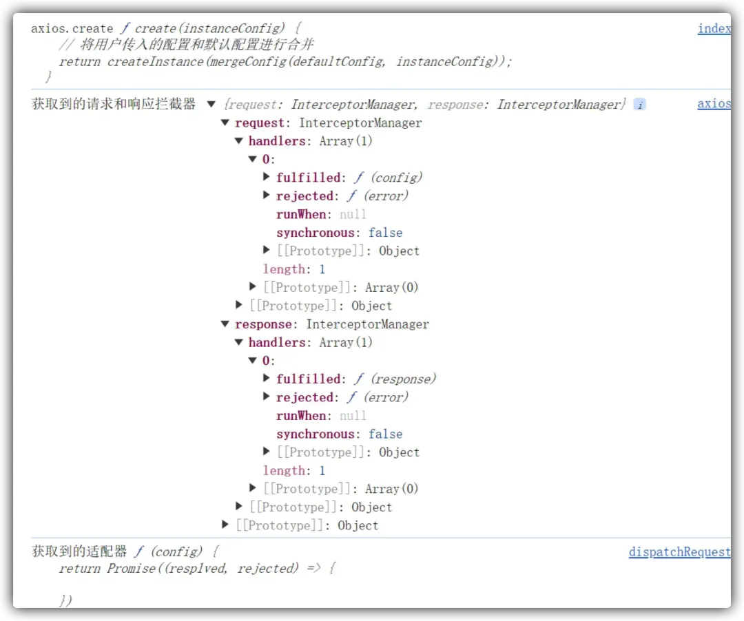紧接着我们开始在 _request 中处理请求和响应拦截器的内容:我们先将请求和响应拦截器打印出来: