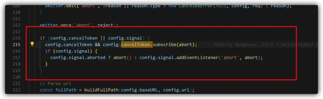 实际上我们查看 http 模块就可以看到在 http 模块中 axios 通过 cancelToken.subscrib 注册了请求取消事件: