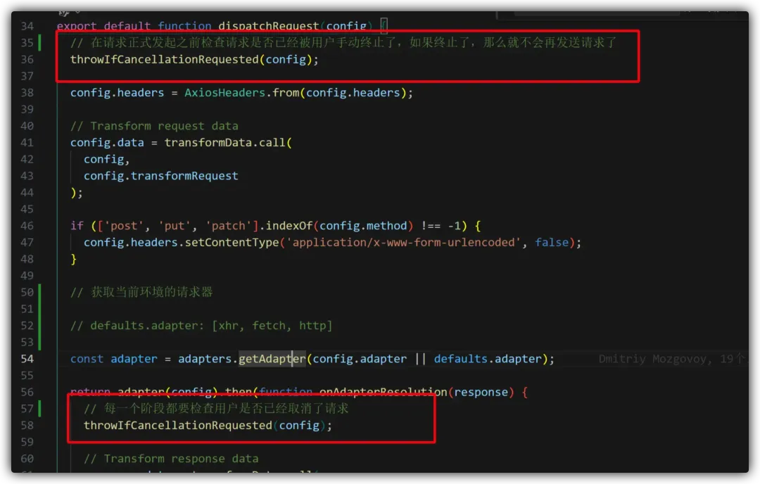 另外如果我们查看 dispatchReques 源码,我们可以看到,如果我们进行了请求取消相关配置,在请求发布的每一个阶段,axios都会调用 throwIfCancellationRequested 方法来检查请求的取消状态,如果发现某一个阶段请求和已经取消了,那么这个阶段以及以后的额任务都不会继续执行了:
