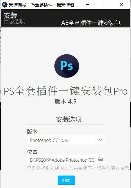 3. 接着软件会自动识别你的PS版本和安装路径,点击“继续”,如果没有识别软件安装路径,那你就手动选择软件安装路径