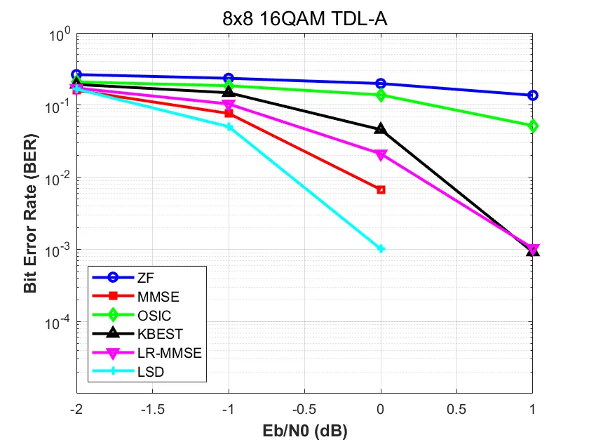 💡 软信息优势:LSD 输出的软 LLR 结合 LDPC 译码,相比硬判决检测器具有显著的编码增益。