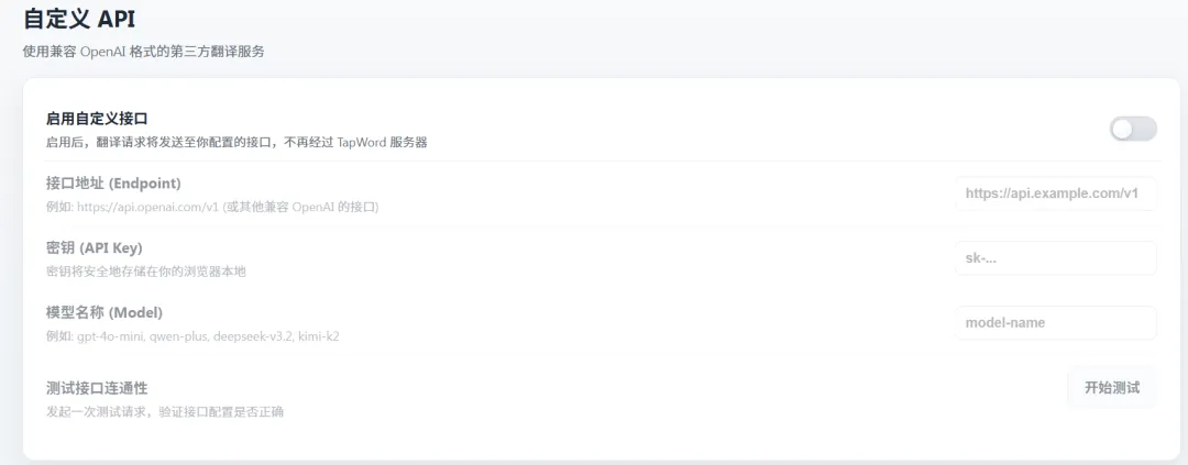 – 接入模型:插件已经接入了翻译模型,可以免费用,如果想接入其它模型,也可以通过下面设置接入。