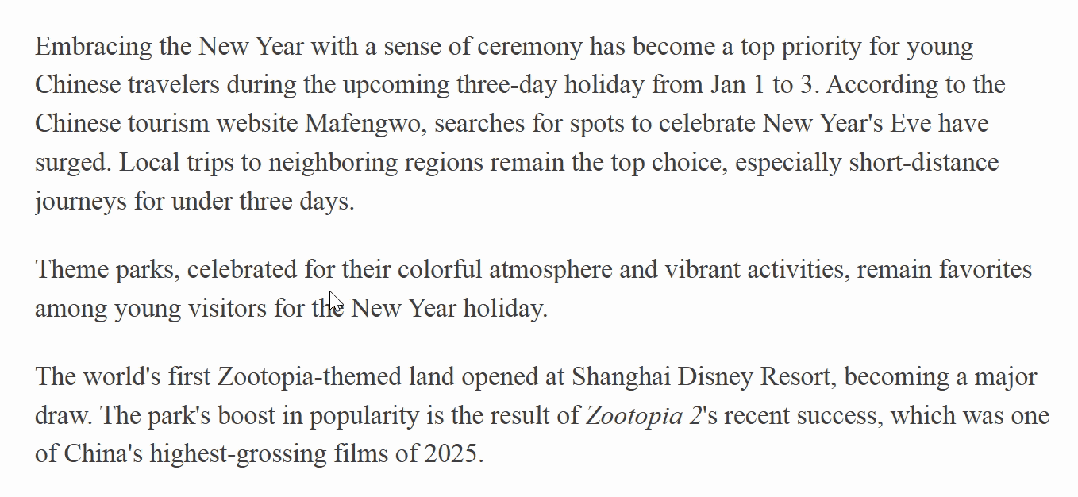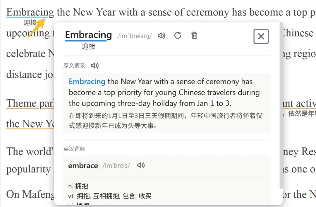 我们设置好插件后就可以直接使用了,双击不会的单词,在下面会立即生成单词的中文意思。