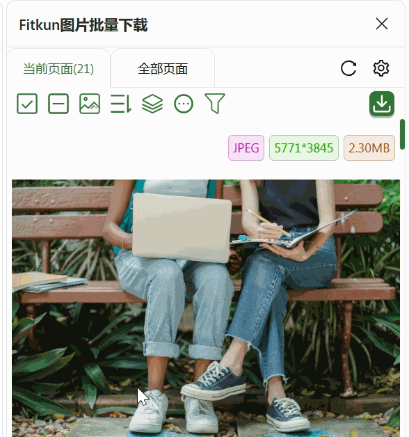 提取出来的图片可以全选,点击上面的下载按钮,一键打包批量下载,也可以单张下载。