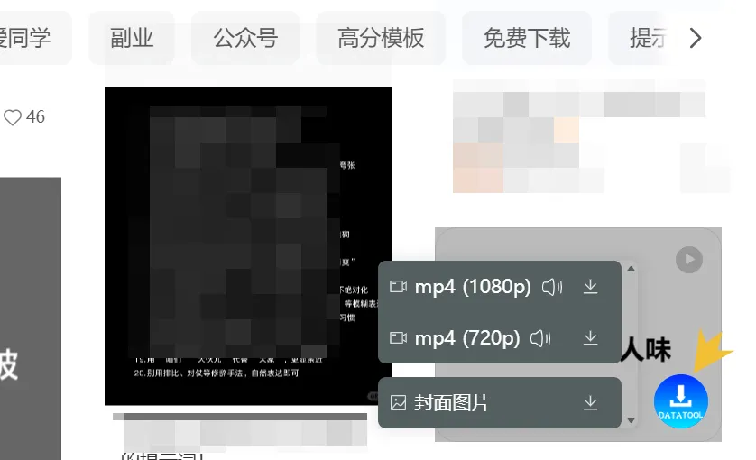 如果是视频作品,点击悬浮按钮就可以无水印下载不同分辨率的视频和作品封面。