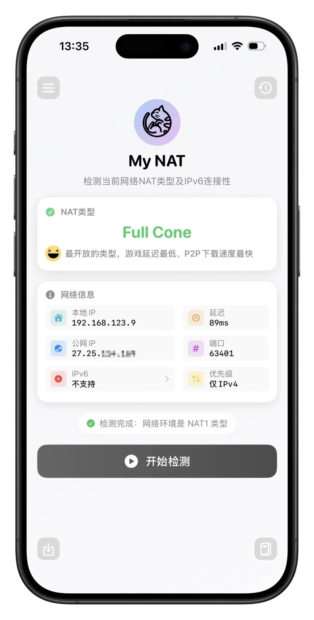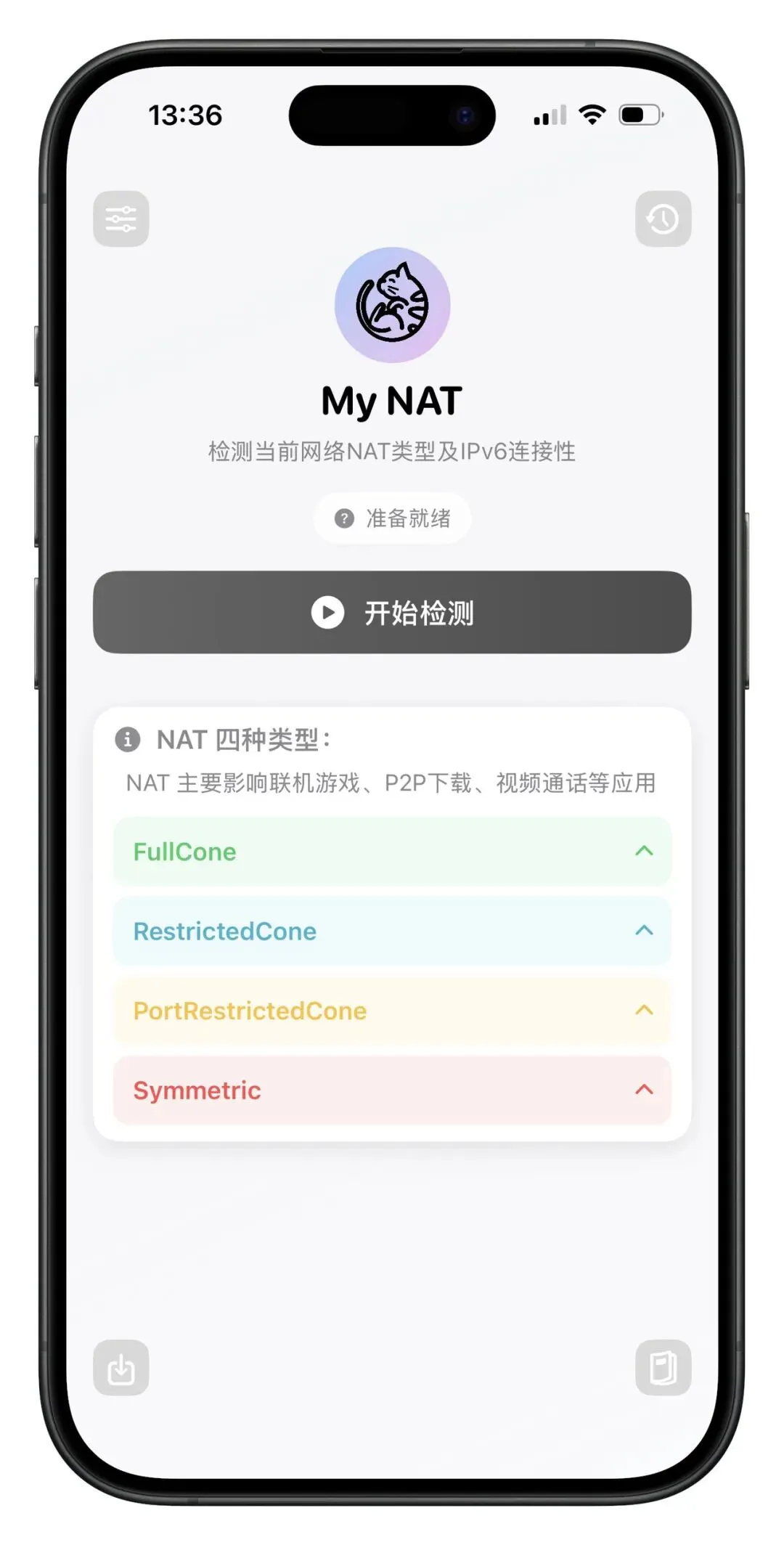 • 检测 NAT 类型(Full Cone / Symmetric 等)