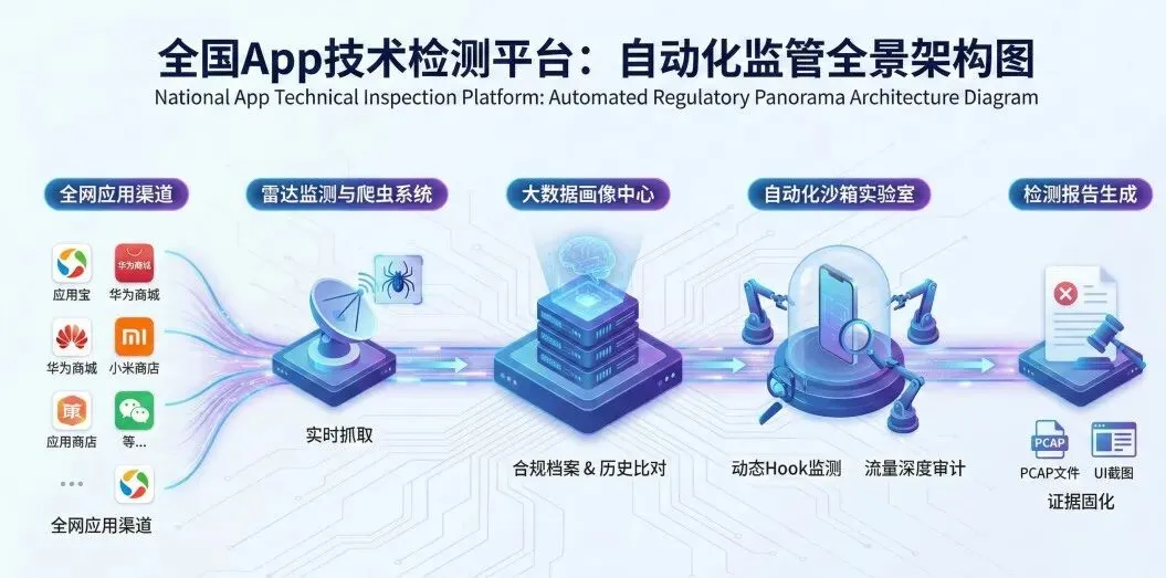为了解决App多,但监测技术人员少的局面, 监管部门依托中国信通院(CAICT)与国家互联网应急中心(CNCERT),构建了一套全天候、全自动的合规探测体系。 App合规已从“人工抽查”时代全面进入“以网管网”的自动化监管时代。