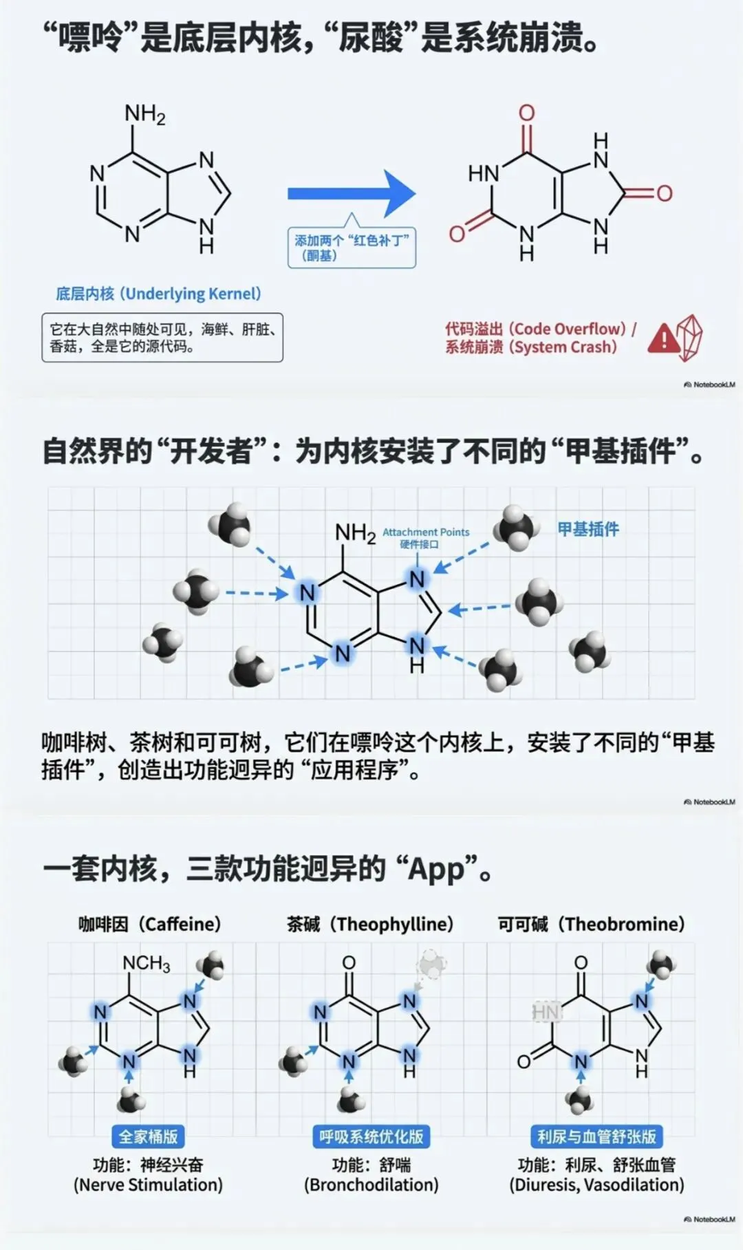 有趣的地方来了:咖啡树、茶树和可可树,它们在嘌呤内核上安装了不同的甲基插件。