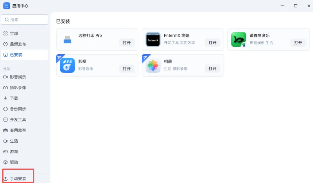 打开应用中心,点击左下角【手动安装】