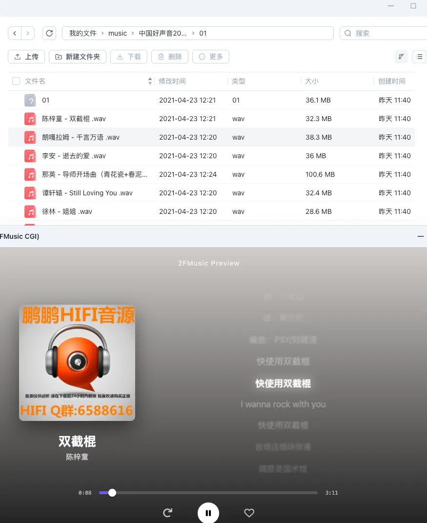 注意,这两个fpk文件都要安装,一个是主程序2FMusic刮削在线播放的,一个是子程序2FMusic-preview可以直接在飞牛NAS 桌面端弹窗形式打开的