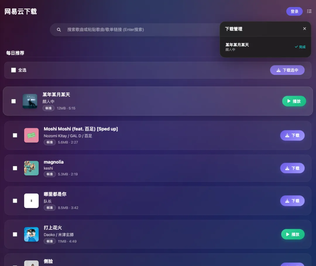 这个直接点击安装一步就搞定了。安装好之后,下图是网易云音乐的每日推荐,可以播放也可以下载。