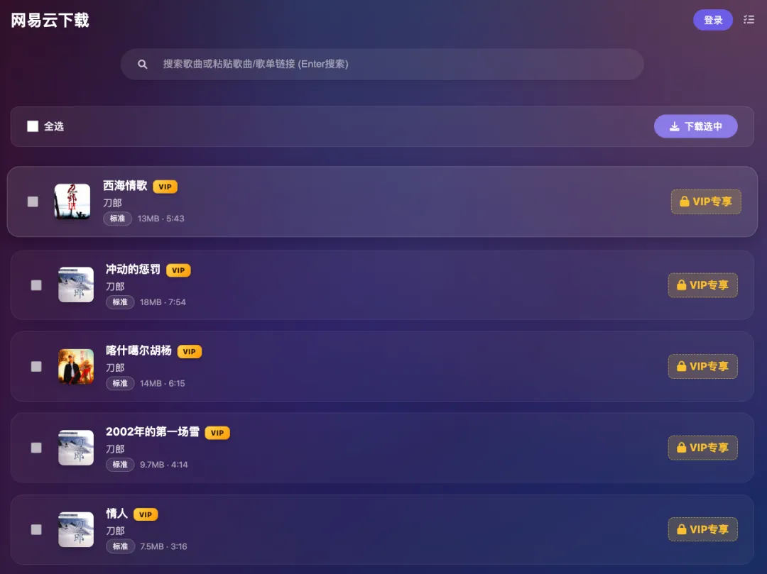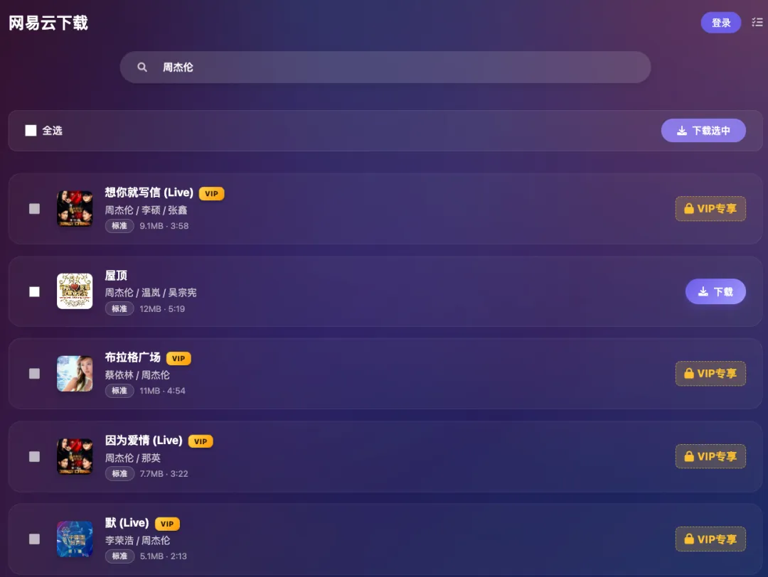 同样,也可以搜索下载,当前未登录网易云账号,vip专享不能下载,而且不能下载的居多。