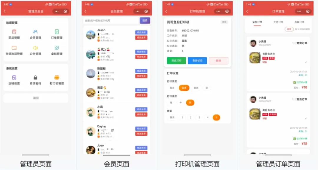 ✅ 菜品管理 – 添加、编辑、删除菜品,设置价格、图片、描述等✅ 菜品分类管理 – 管理菜品分类,支持排序✅ 会员管理 – 查看会员列表,修改会员余额和免单次数✅ 订单管理 – 查看所有订单✅ 充值选项管理 – 设置充值套餐和赠送规则✅ 公告管理 – 设置小程序公告信息,发布优惠活动系统设置