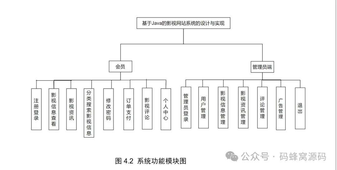 影视网站系统包括系统 用户管理、影视资讯管理、 影视类别管理、 影视管理、 评价管理等模块。整个系统的功能模块设计如图: