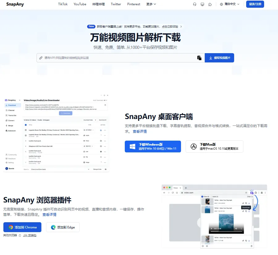 https://snapany.com/zh,可以在线使用,可以下载桌面客户端和浏览器插件。