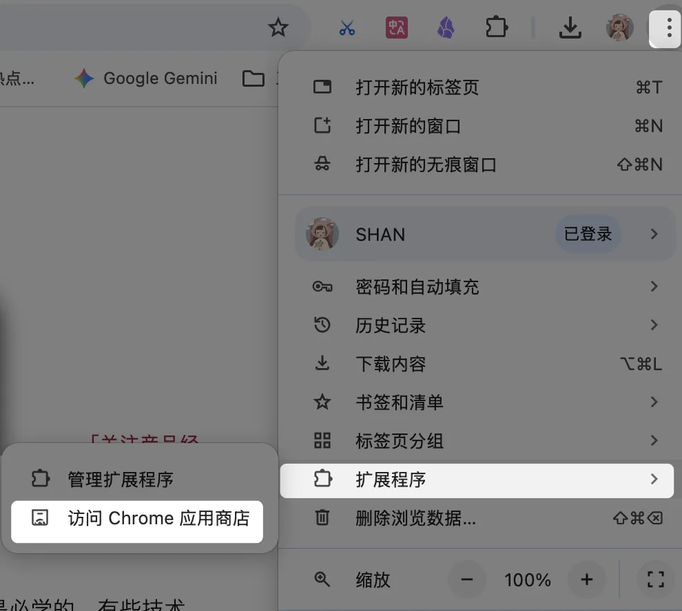 2. 点击右上角更多按钮>扩展程序>访问Chrome应用商店(🪄)