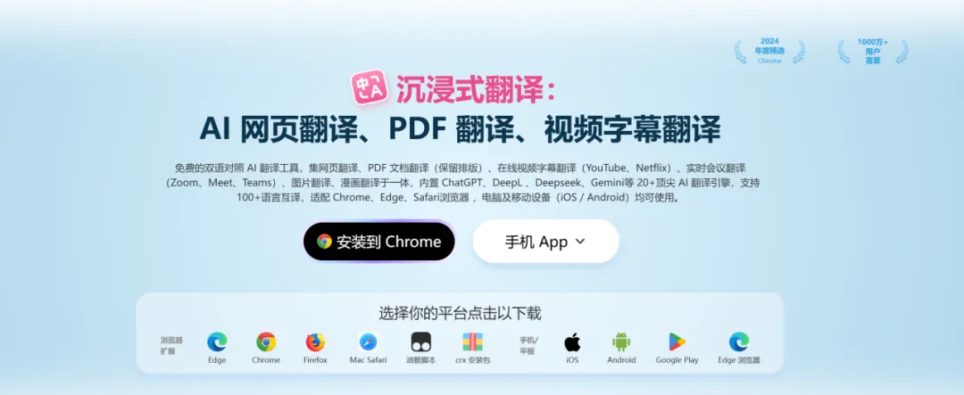 先给大家简单介绍一下,沉浸式翻译是一款跨设备、跨平台在线翻译插件。它支持网页翻译、文档翻译、视频双语字幕、输入框实时翻译,甚至是看漫画……它适用所有主流浏览器,同时支持安卓、iOS。
