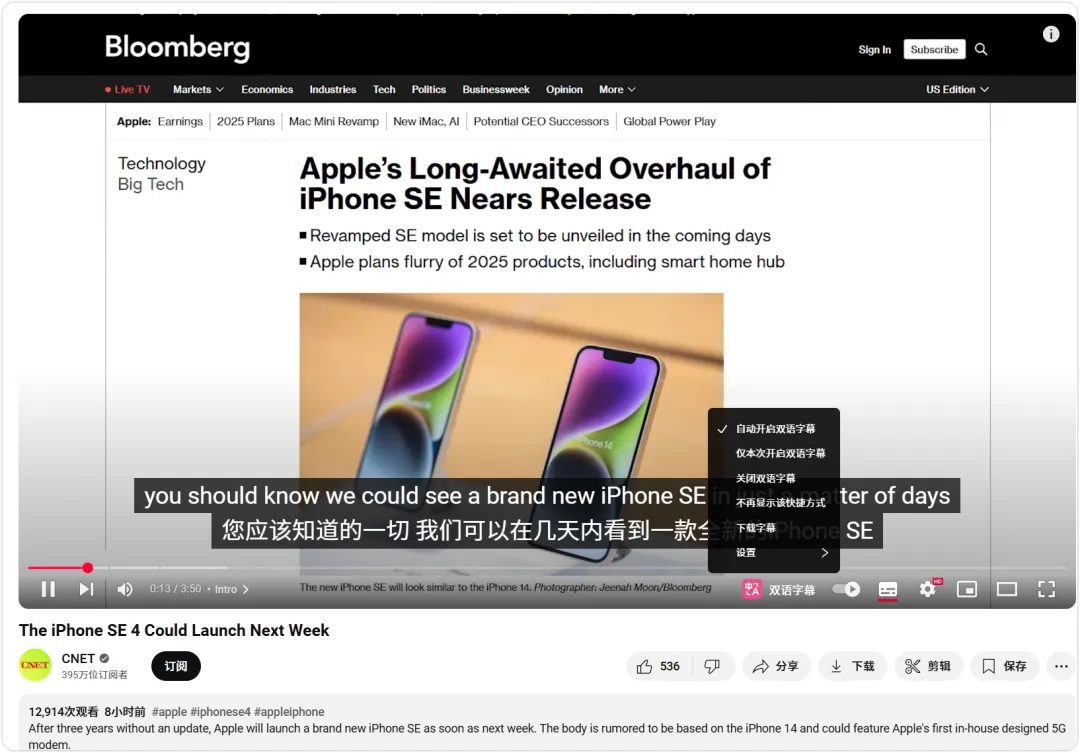 它支持包括油管、Netflix在内的60多家国际主流视频平台。只要视频有外挂字幕,它就能实时生成中英双语对照字幕,让你在看片的同时还能学英语。