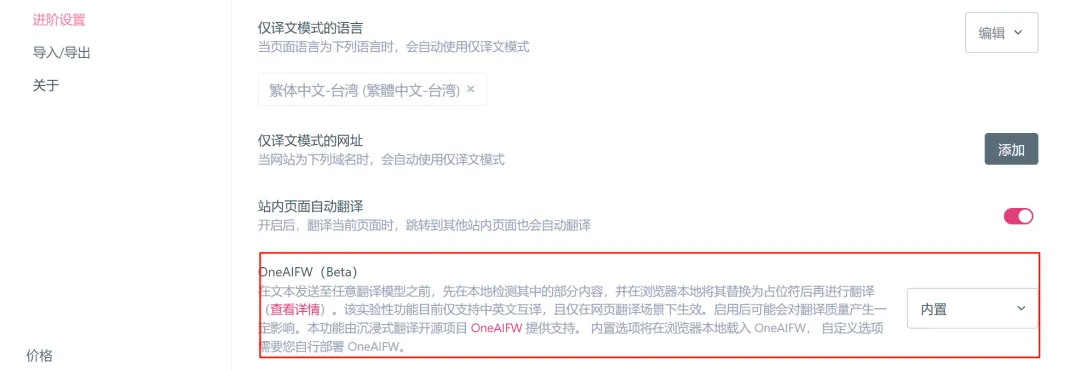 要开启这个功能也很简单,沉浸式翻译面板→设置→进阶设置→OneAIFW(beta)→选择「内置」