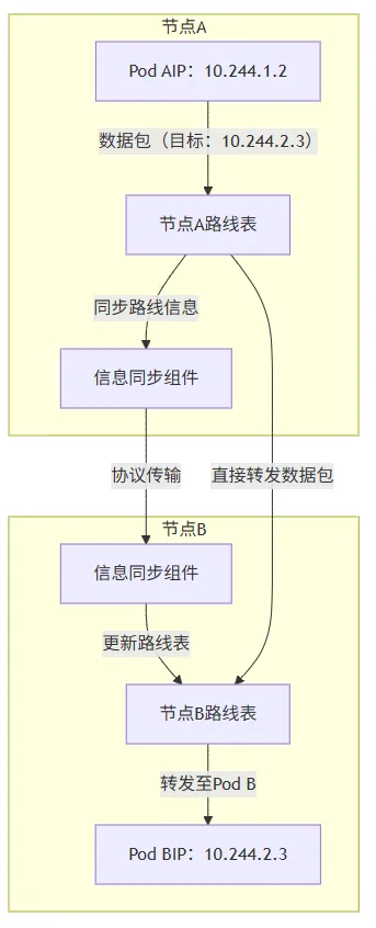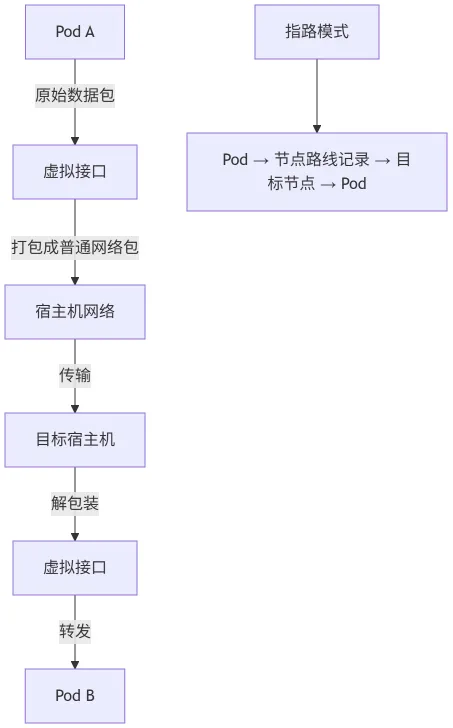 “指路模式”则直接在节点上记录其他节点的Pod位置,不用打包直接转发,但要求所有节点在同一网络环境下。