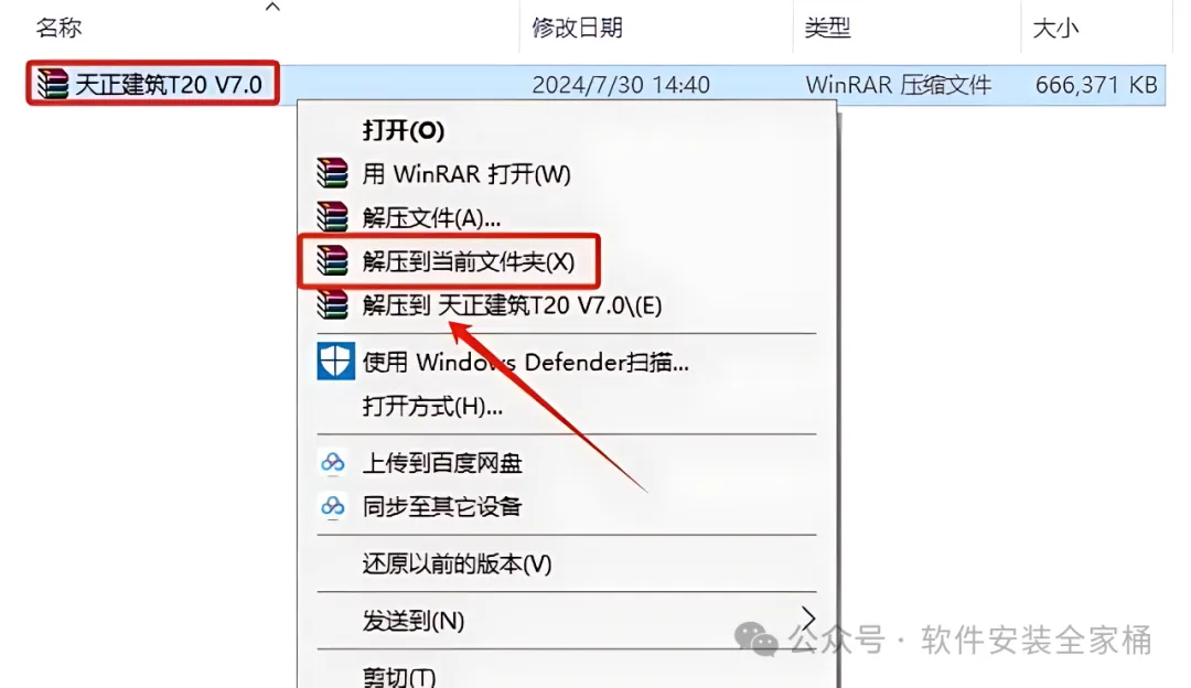 1.选中下载的天正建筑T20 V7.0安装包,鼠标右击选择【解压到当前文件夹】。