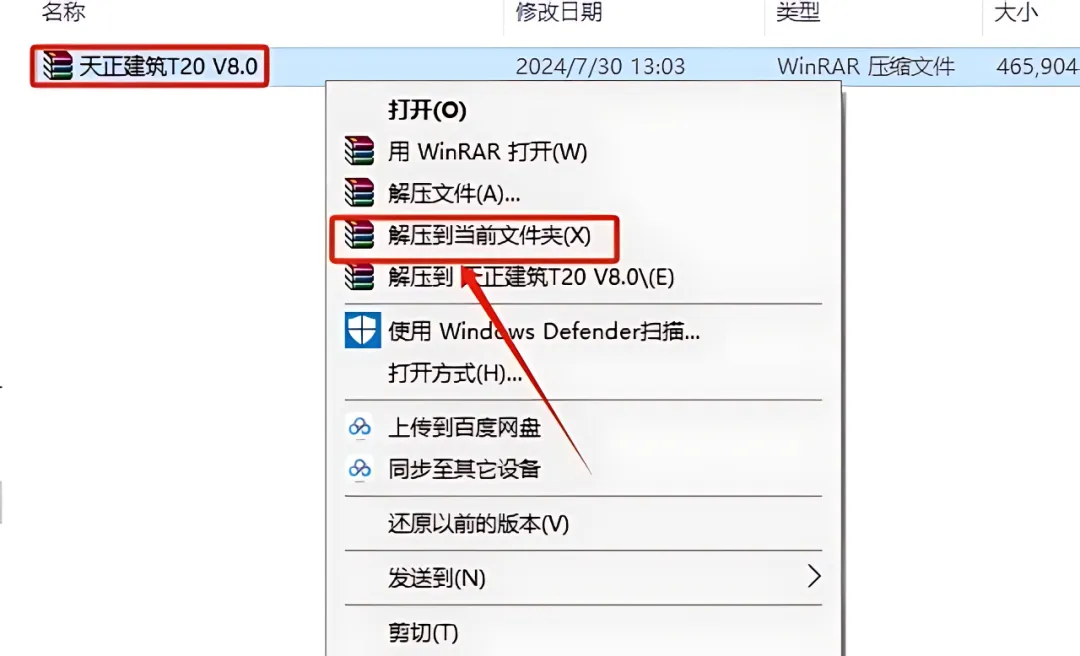 1.选中下载的天正软件安装包,鼠标右击选择【解压到当前文件夹】。