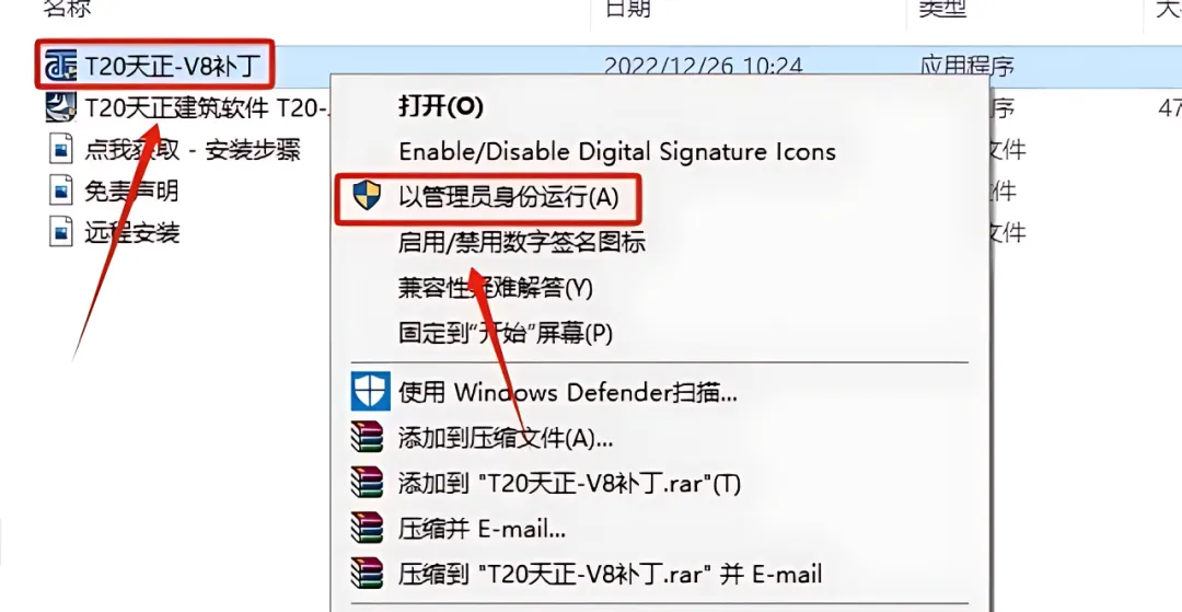 3.鼠标右击【T20天正建筑软件 T20-Arch V8.0】安装程序,选择【以管理员身份运行】。