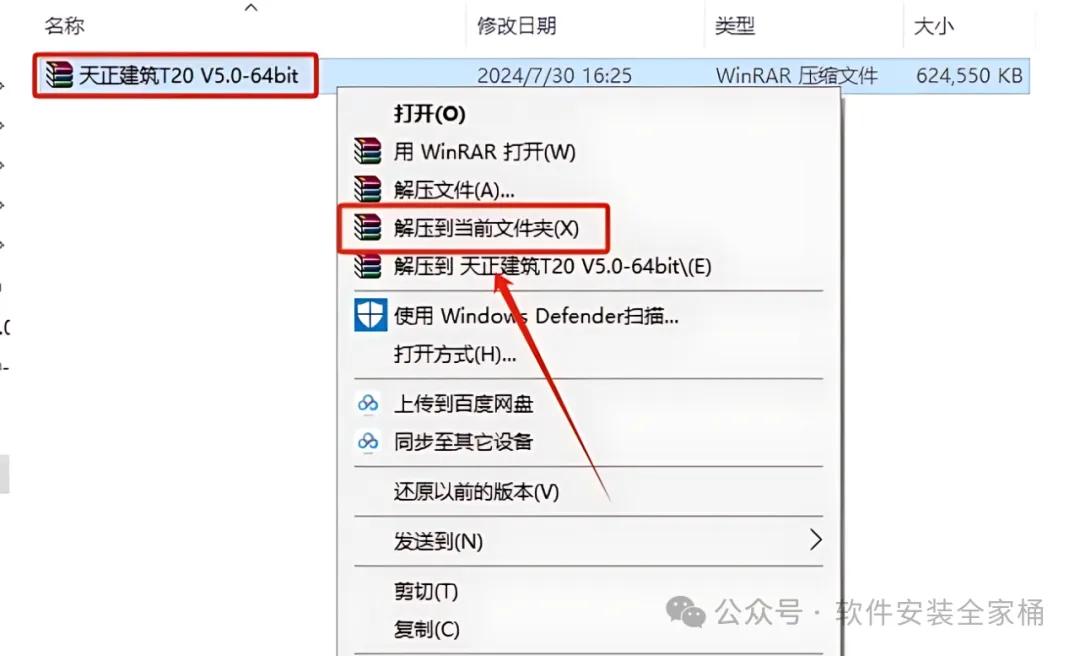 1.选中下载的天正软件安装包,鼠标右击选择【解压到当前文件夹】。