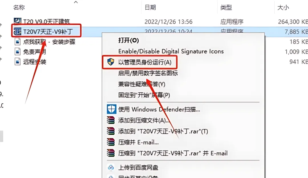 10.返回到解压的安装包文件夹中,鼠标右击【天正T20V7-V9补丁】,选择【以管理员身份运行】。
