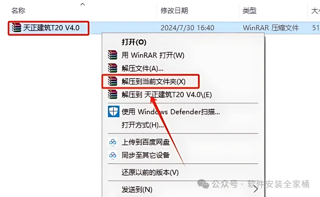 1.选中下载的天正软件安装包,鼠标右击选择【解压到当前文件夹】。