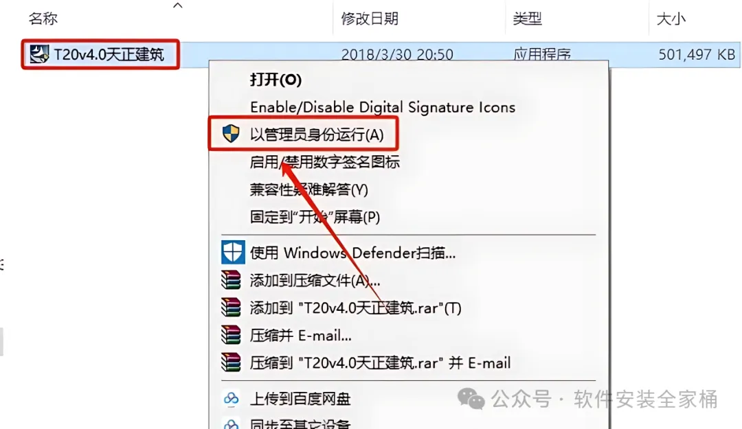 4.鼠标右击【T20V4.0天正建筑】安装程序,选择【以管理员身份运行】。
