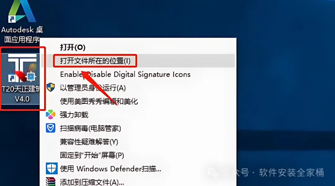 11.在桌面找到T20天正建筑V4.0软件图标,鼠标右击选择打开文件所在位置。