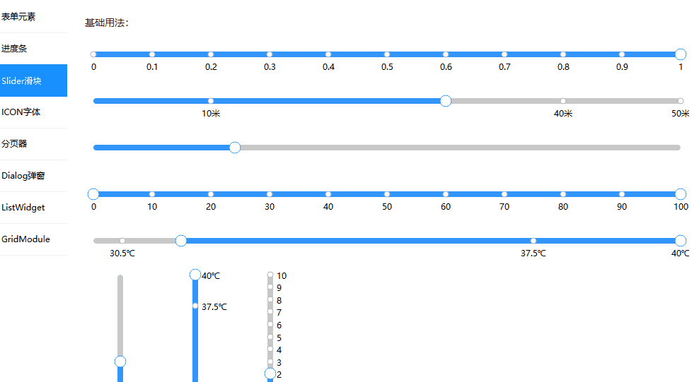 #include "sliderwidgetpage.h"SliderWidgetPage::SliderWidgetPage(QWidget *parent): QWidget(parent),ui(new Ui::SliderWidgetPageClass){ui->setupUi(this);ui->widget1->setOrientation(DiscreteRangeSlider::Horizontal);ui->widget1->setMode(DiscreteRangeSlider::Single);ui->widget1->setRange(0, 1);ui->widget1->setStep(0.1); // 连续 间隔ui->widget1->setShowTicks(true);ui->widget1->setShowTickLabels(true);ui->widget1->setValue(30);//valueChanged 信号槽connect(ui->widget1, &DiscreteRangeSlider::valueChanged, [this](double currentValue) mutable {qDebug() << "currentValue:" << currentValue;});ui->widget2->setOrientation(DiscreteRangeSlider::Horizontal);ui->widget2->setMode(DiscreteRangeSlider::Single);ui->widget2->setRange(0, 50);ui->widget2->setStep(10); // 连续 间隔ui->widget2->setShowTicks(true);ui->widget2->setShowTickLabels(true);ui->widget2->setValue(30);//valueChanged 信号槽connect(ui->widget2, &DiscreteRangeSlider::valueChanged, [this](double currentValue) mutable {qDebug() << "currentValue:" << currentValue;});ui->widget2->setTickLabels(QMap<double, QString>{{10, "10米"},{40, "40米" },{50, "50米" }});//没有刻度的sliderui->widget3->setOrientation(DiscreteRangeSlider::Horizontal);ui->widget3->setMode(DiscreteRangeSlider::Single);ui->widget3->setRange(0, 100);ui->widget3->setShowTicks(false);ui->widget3->setShowTickLabels(false);ui->widget3->setValue(30);//valueChanged 信号槽connect(ui->widget3, &DiscreteRangeSlider::valueChanged, [this](double currentValue) mutable {qDebug() << "widget3 currentValue:" << currentValue;});ui->widget4->setOrientation(DiscreteRangeSlider::Horizontal);ui->widget4->setMode(DiscreteRangeSlider::RangeMode);ui->widget4->setRange(0, 100);ui->widget4->setStep(10);ui->widget4->setShowTicks(true);ui->widget4->setShowTickLabels(true);ui->widget4->setValue(30);//valueChanged 信号槽connect(ui->widget4, &DiscreteRangeSlider::rangeChanged, [this](double minValue,double maxValue) mutable {qDebug() << "widget4 minValue:" << minValue << ";maxValue:" << maxValue;});ui->widget5->setOrientation(DiscreteRangeSlider::Horizontal);ui->widget5->setMode(DiscreteRangeSlider::RangeMode);ui->widget5->setRange(30, 40);ui->widget5->setStep(0.5);ui->widget5->setShowTicks(true);ui->widget5->setShowTickLabels(true);ui->widget5->setValue(30);//valueChanged 信号槽connect(ui->widget5, &DiscreteRangeSlider::rangeChanged, [this](double minValue, double maxValue) mutable {qDebug() << "widget5 minValue:" << minValue << ";maxValue:" << maxValue;});ui->widget5->setTickLabels(QMap<double, QString>{{30.5, "30.5℃"},{37.5, "37.5℃"},{ 40, "40℃" }});//垂直1ui->widget6->setOrientation(DiscreteRangeSlider::Vertical);ui->widget6->setMode(DiscreteRangeSlider::RangeMode);ui->widget6->setRange(30, 40);ui->widget6->setStep(0.5);ui->widget6->setShowTicks(true);ui->widget6->setShowTickLabels(true);ui->widget6->setValue(30);//valueChanged 信号槽connect(ui->widget6, &DiscreteRangeSlider::rangeChanged, [this](double minValue, double maxValue) mutable {qDebug() << "widget6 minValue:" << minValue << ";maxValue:" << maxValue;});ui->widget6->setTickLabels(QMap<double, QString>{{37.5, "37.5℃"},{ 40, "40℃" }});//垂直2ui->widget7->setOrientation(DiscreteRangeSlider::Vertical);ui->widget7->setMode(DiscreteRangeSlider::Single);ui->widget7->setRange(0, 100);ui->widget7->setStep(10);ui->widget7->setShowTicks(false);ui->widget7->setShowTickLabels(false);ui->widget7->setValue(30);//valueChanged 信号槽connect(ui->widget7, &DiscreteRangeSlider::rangeChanged, [this](double minValue, double maxValue) mutable {qDebug() << "widget7 minValue:" << minValue << ";maxValue:" << maxValue;});//垂直3ui->widget8->setOrientation(DiscreteRangeSlider::Vertical);ui->widget8->setMode(DiscreteRangeSlider::Single);ui->widget8->setRange(0, 10);ui->widget8->setStep(1);ui->widget8->setShowTicks(true);ui->widget8->setShowTickLabels(true);ui->widget8->setValue(2);//valueChanged 信号槽connect(ui->widget8, &DiscreteRangeSlider::valueChanged, [this]( double current) mutable {qDebug() << "widget8 current:" << current ;});}SliderWidgetPage::~SliderWidgetPage(){}