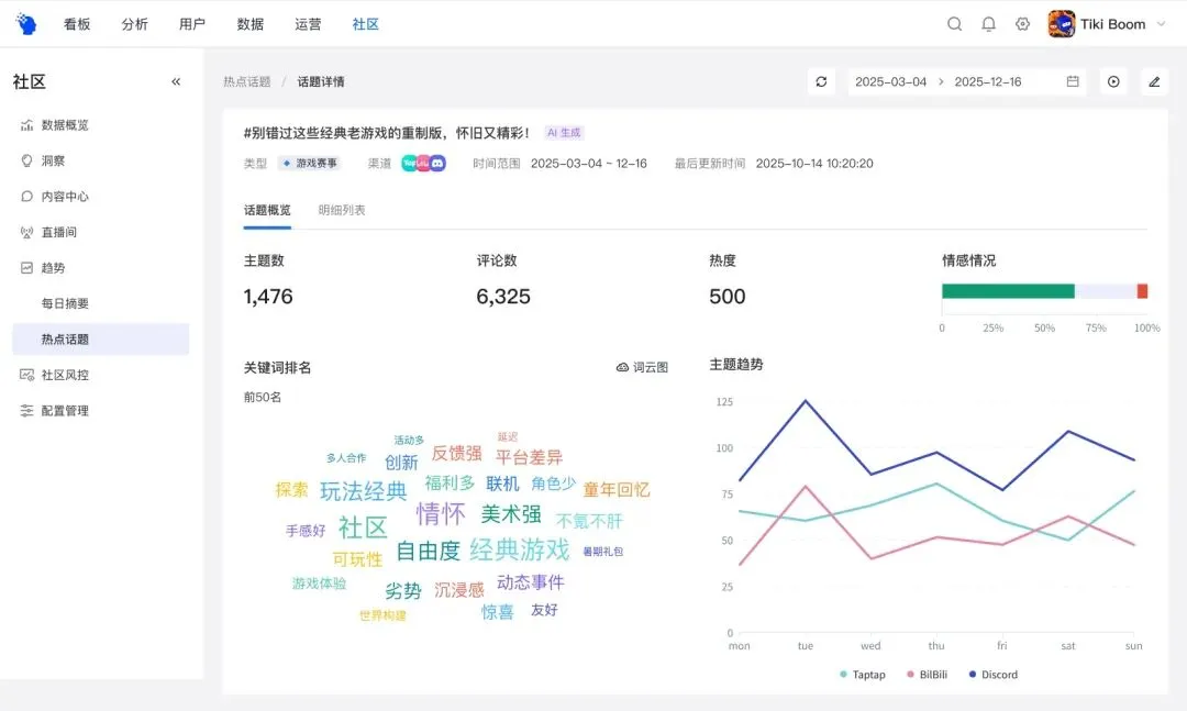 而看见这些隐藏需求,正是抓住用户的关键。数数科技旗下数据智能基础设施 ThinkingEngine(简称“TE 系统”),可以收集来自产品内部和主流媒体平台的数据,然后通过全链路行为埋点、多维度数据洞察、用户分层建模与社区热点话题提取等等方法,追踪用户全链路行为数据、关联业务与反馈数据,从海量数据中提炼出有增长潜力的 “小需求”。