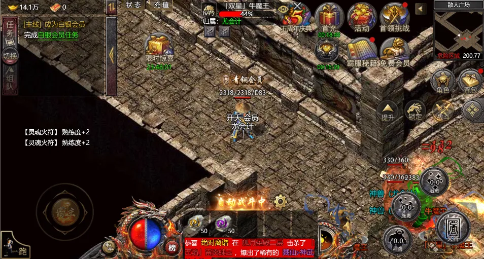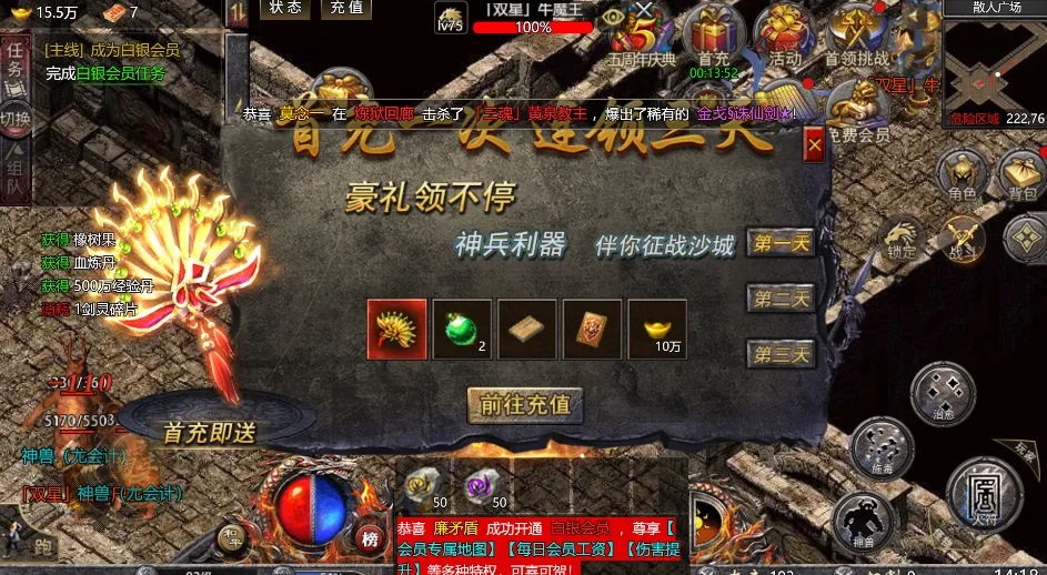 2、首冲:首冲领取三天,送对应天赋武器和职业技能和最重要的嗜血玉佩+3
